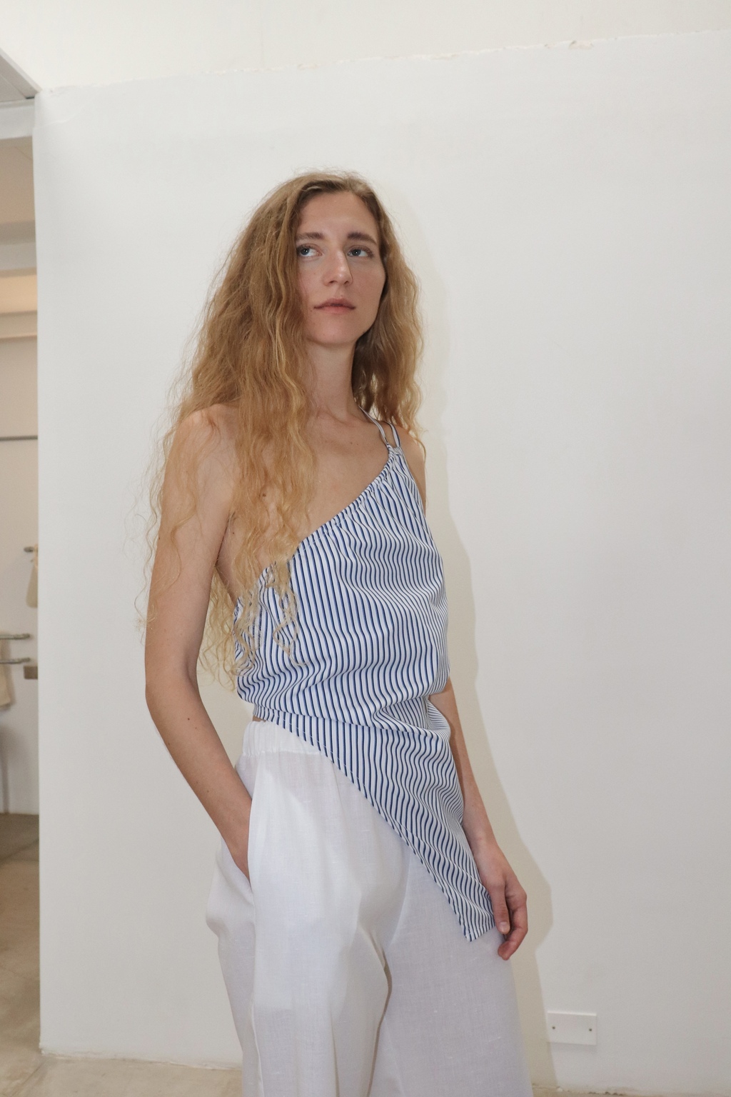 Pantalón con elástico, bolsillos a los costados invisibles en Lino blanco.